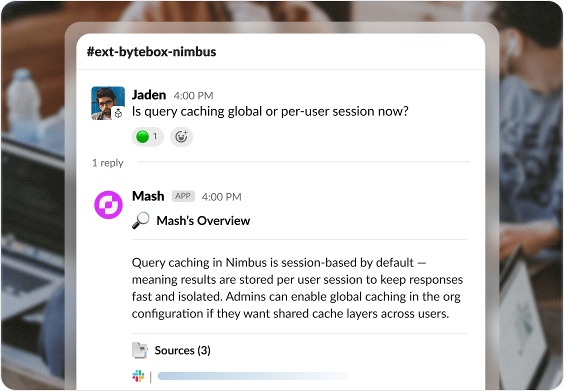 Have Mash automatically respond to customers and prospects in Slack Connect channels. Being made available for community site deployment and via API for design partners.