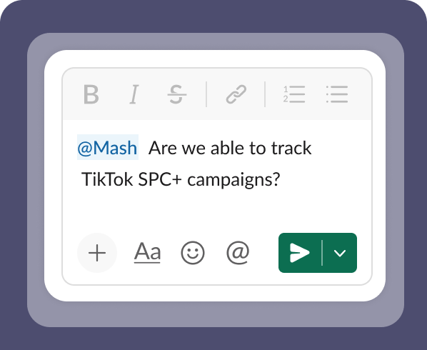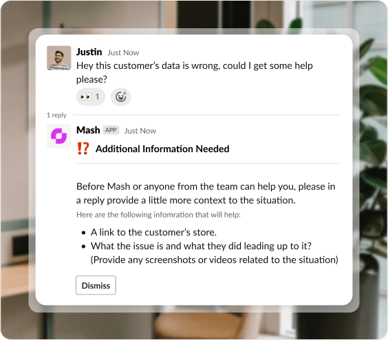 Whether it is Mash providing automated help right before a meeting, or you asking privately for a quick answer. From finding the latest pitch deck, answering a customer product question, or handling an objection on a call – it's right in Slack.