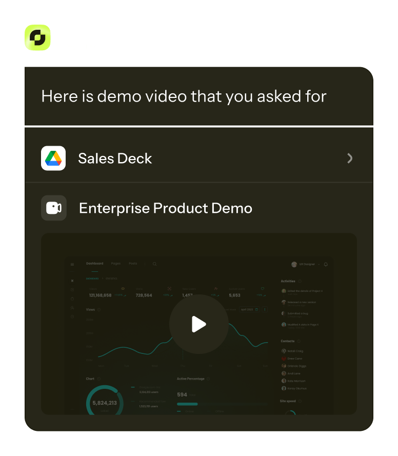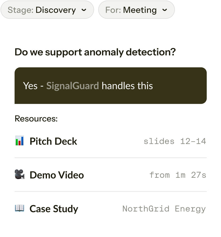 Get instant access to product details, proof points, and positioning so you can answer questions on the spot and keep momentum high.
