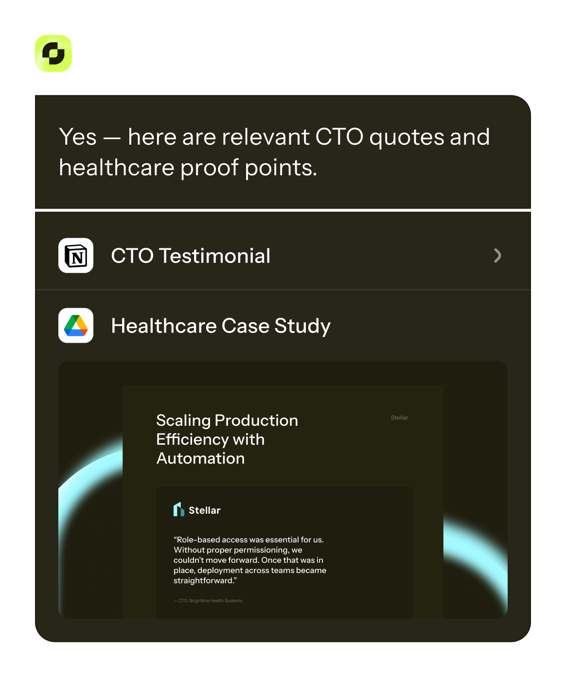Instant access to trusted answers and shared context means better meeting prep, confident client responses, and stronger sales execution.