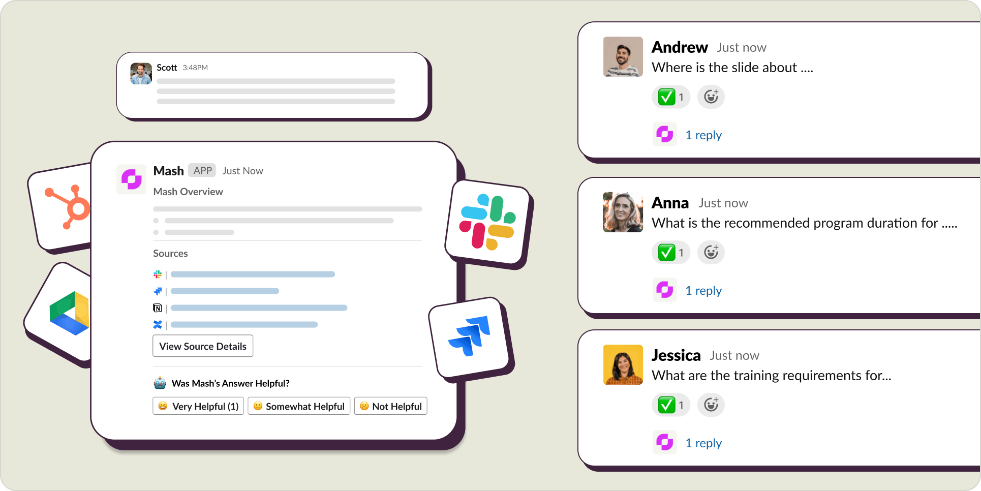 Nevvon implemented Mash, a Slack-native AI knowledge engine, to centralize internal knowledge and reduce dependency on SMEs. Mash unified information from Slack, Jira, Google Drive, HubSpot, and other systems into a single, searchable intelligence layer. Reps could now ask complex questions in Slack and receive high-trust answers instantly.